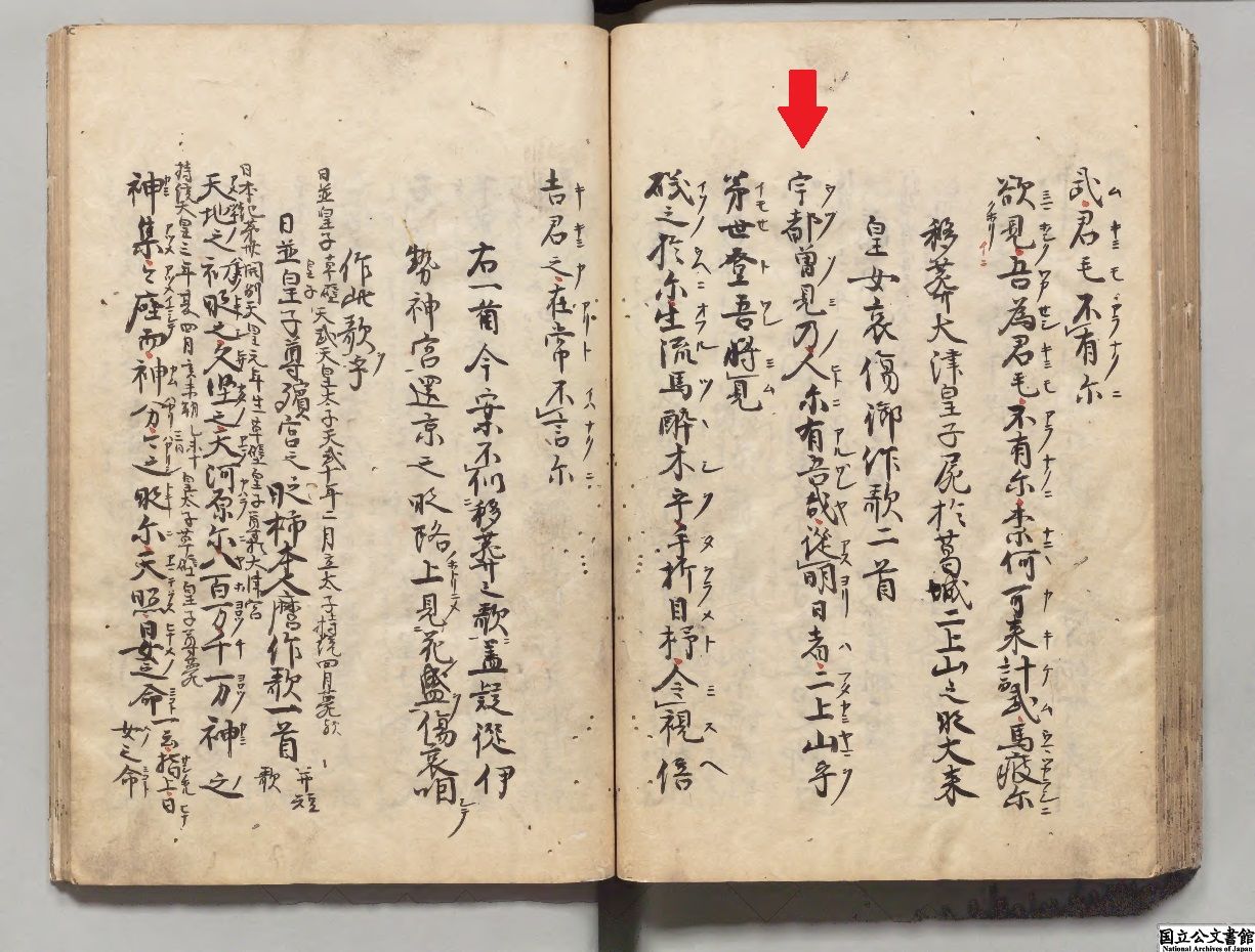 ট ইট র 国立公文書館 うつそみの人にある我れや明日よりは二上山を弟背と我見む 朱鳥元年 686 10月3日 大津皇子 天武天皇の皇子 が謀反の疑いにより自害 その死を悼み 姉の大伯皇女が詠んだ和歌が 万葉集 に収められています 画像は林羅山旧蔵書